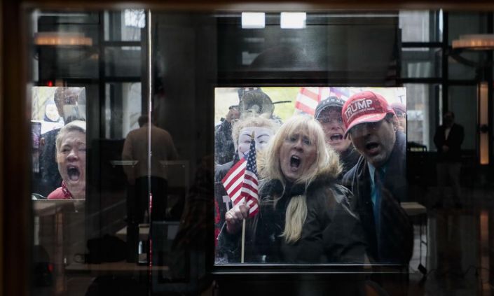 CAPTION: Joshua Bickel, a photojournalist for the Columbus Dispatch, covered a protest outside Ohio governor Mike DeWine’s daily press briefing. A hundred protesters had gathered. They pressed up against the glass outside the governor’s office, demanding Ohio reopen for business.