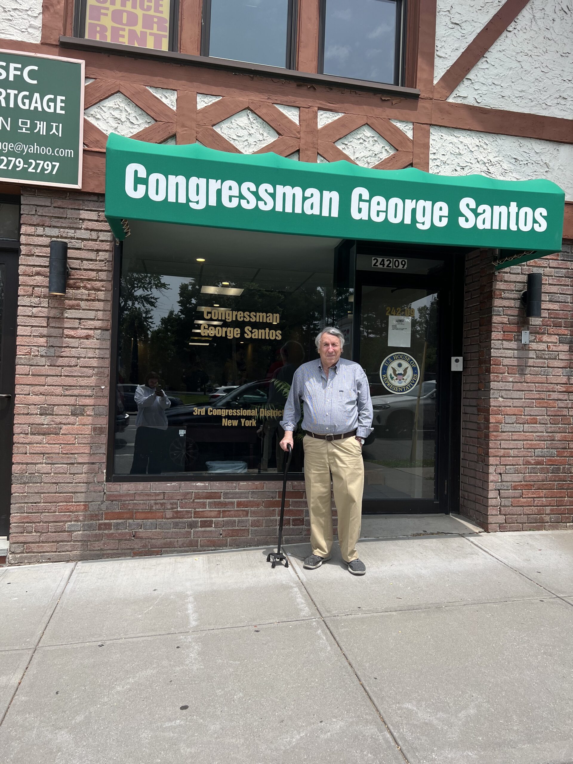 GEORGE SANTOS (photo): An appointment in Great Neck. Crossing the street, we noticed that George Santos, the disgraced first-term Congressman, has his office here. Naturally, this called for a photo op. Our visit was well-timed: Santos has declined to tell the court who posted his $183,000 bail. The day after our photo op, a federal court released their names.